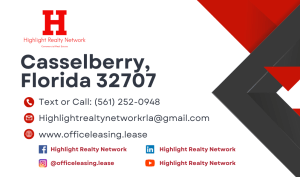 We have 2732 SF Suite 196 Professional and Medical Office Space at 1211 Semoran Blvd., Casselberry, FL 32707. We offer 3 Free Months of Rent on the base rent, one per year. Come and Visit our Office Space. We are committed to providing exceptional service to our tenants and maintaining a safe and enjoyable working environment. If you have questions or want to schedule a building tour, please get in touch with us at [561-252-0948] or [Highlightrealtynetworkrla@gmail.com]. We are excited to hear from you and may welcome you as a new tenant in our building. Thank you for considering us as your new home in Casselberry, FL.