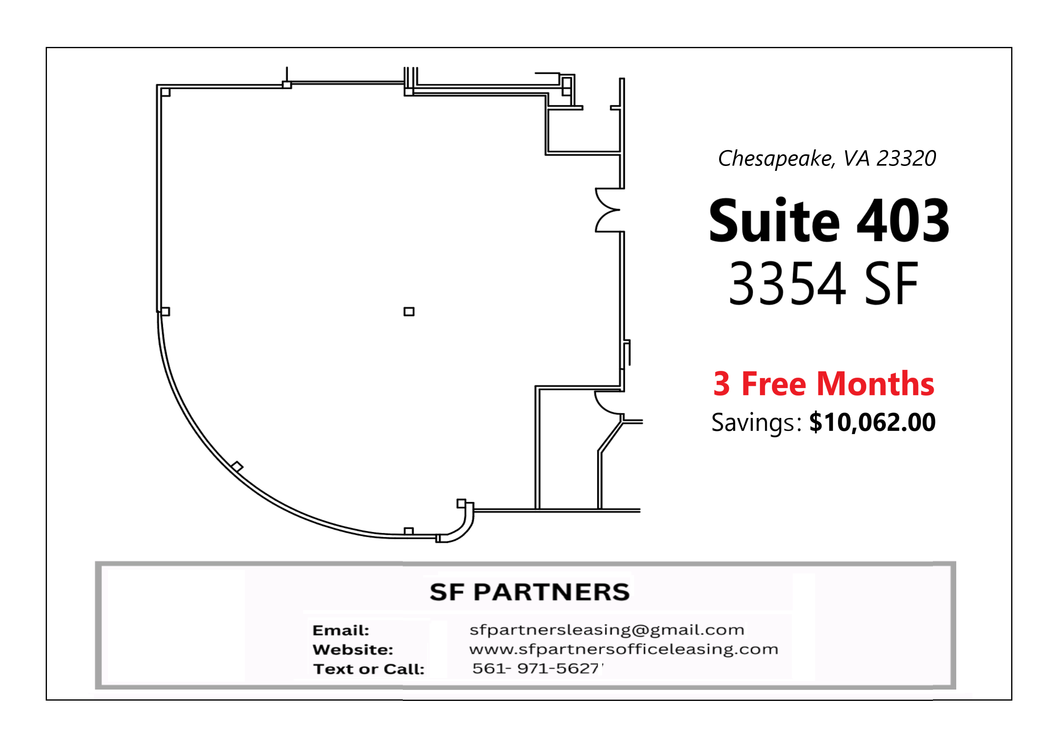 This 3354 SF Suite 403 Professional Office Space is Now Available for Rent. It is located at 870 Greenbrier Cir., Chesapeake, Virginia 23320. We offer 3 FREE MONTHS of rent on the base rent, one per year, with rates including utilities, building services, and property expenses. In addition, this workspace is spacious and will keep you comfy as you work, ideal for your business. Talk to us and book your viewing now! We are committed to providing exceptional service to our tenants and maintaining a safe and enjoyable working environment. If you have any questions or want to schedule a building tour, please contact us at [1-561-971-5627] or [sfpartnersleasing@gmail.com]. We are excited to hear from you and may welcome you as a new tenant in our building. Thank you for considering us as your new home in Chesapeake, VA.