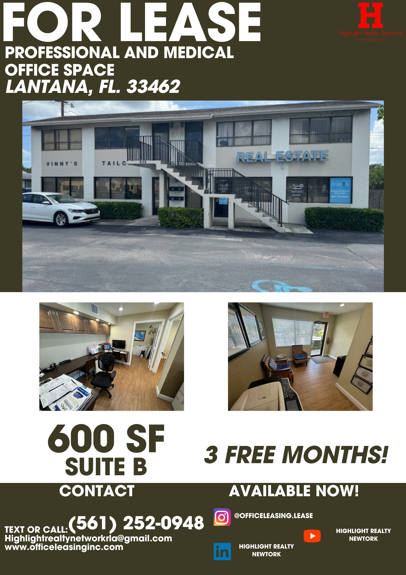 This is 600 SF Suite B Professional and Medical Office Space. It is available for rent in Lantana, Florida 33462, at a very affordable price that is good for you and your business. Visit now and make an appointment today. We are committed to providing exceptional service to our tenants and maintaining a safe and enjoyable working environment. If you have questions or want to schedule a building tour, please contact us at [561-252-0948] or [Highlightrealtynetworkrla@gmail.com]. We are excited to hear from you and may welcome you as a new tenant in our building. Thank you for considering us as your new West Palm Beach, FL home.