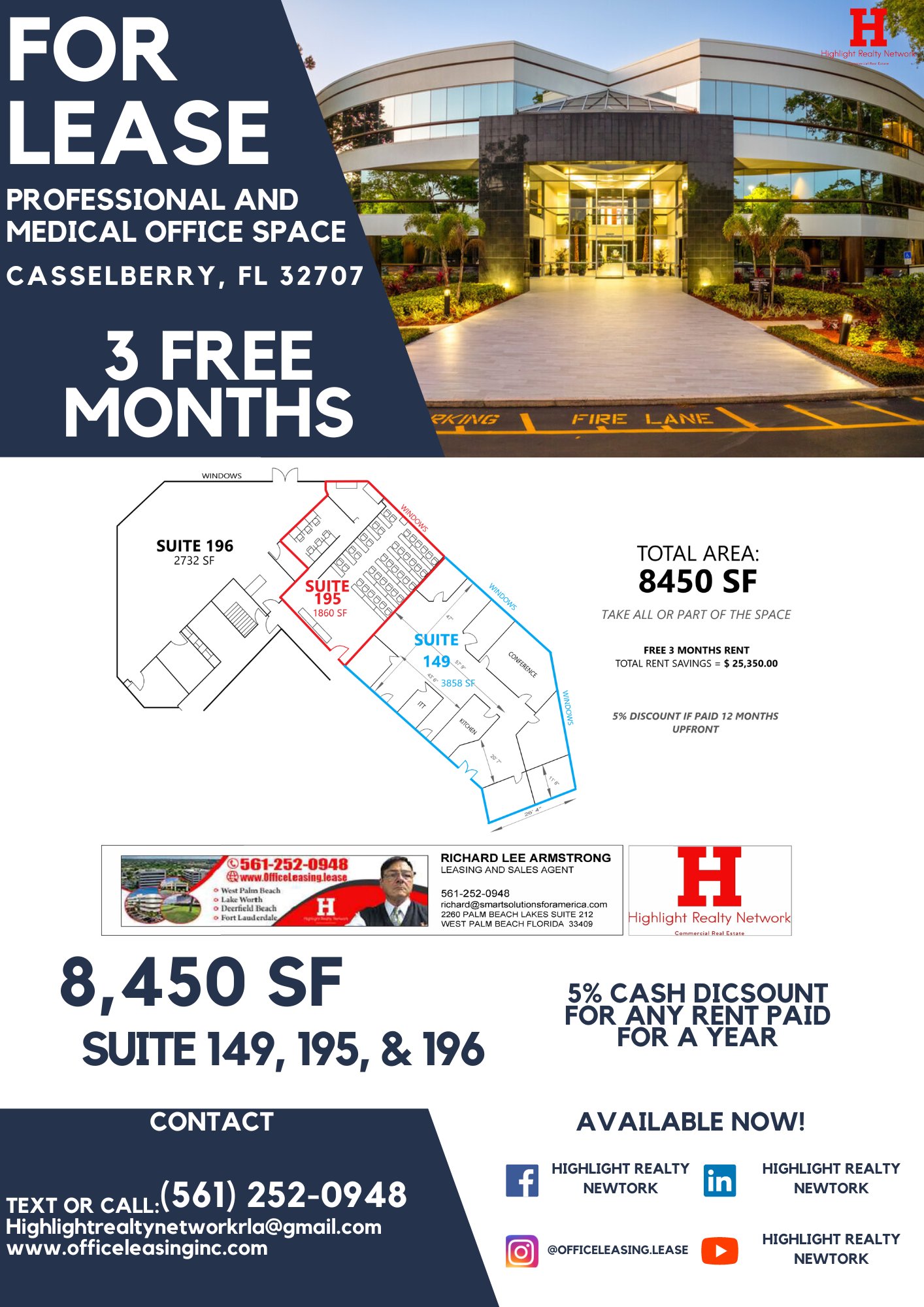 We have 8450 SF Professional and Medical Office Space at 1211 Semoran Blvd., Casselberry, FL 32707. We offer 3 Free Months of Rent on the base rent, one per year. Come and Visit our Office Space. We are committed to providing exceptional service to our tenants and maintaining a safe and enjoyable working environment. If you have questions or want to schedule a building tour, please contact us at [561-252-0948] or [Highlightrealtynetworkrla@gmail.com]. We are excited to hear from you and may welcome you as a new tenant in our building. Thank you for considering us as your new home in Casselberry, FL.