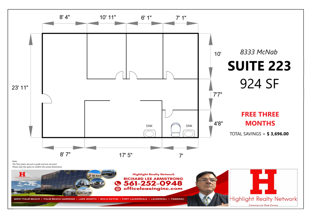 This 924 SF Suite 223 Professional and Medical Office Space is at 8333 McNab Rd., Tamarac, FL 33321. Available Now. It is a very affordable price for you and your business. Visit now and make an appointment today. We are committed to providing exceptional service to our tenants and maintaining a safe and enjoyable working environment. If you have questions or want to schedule a building tour, please contact us at [561-252-0948] or [Highlightrealtynetworkrla@gmail.com]. We are excited to hear from you and may welcome you as a new tenant in our building. Thank you for considering us as your new home in Tamarac, FL.
