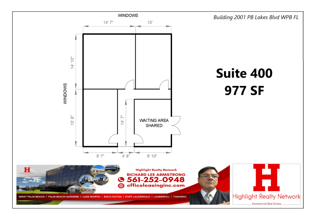 We have 977 SF of Suite 400 Professional and Medical Office Spaces available at 2001 Palm Beach Lakes Blvd., West Palm Beach, FL 33409, at a very affordable price that is ideal for you and your business. Visit now and make an appointment today. We are committed to providing exceptional service to our tenants and maintaining a safe and enjoyable working environment. If you have questions or want to schedule a building tour, please contact us at [561-252-0948] or [Highlightrealtynetworkrla@gmail.com]. We are excited to hear from you and may welcome you as a new tenant in our building. Thank you for considering us as your new home in West Palm Beach, FL.
